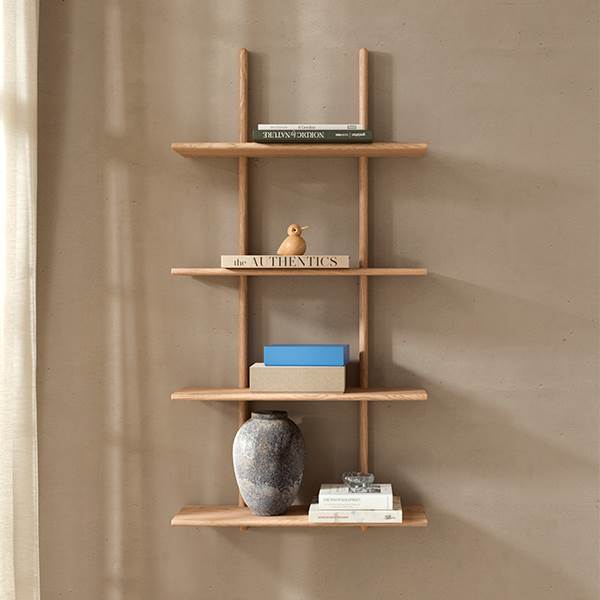 Essence er designet med faste hylder, der giver et harmonisk og helstøbt look. De fire rummelige hylder skaber plads til både opbevaring og udstilling, og ved at kombinere flere Essence hylder kan du nemt skabe en større, sammenhængende vægopstilling. Dette gør hylden til en fleksibel løsning for både små og store rum.