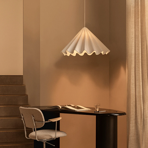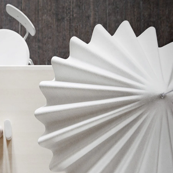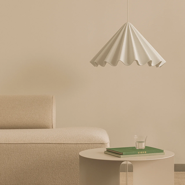 Den udtryksfulde pendel henter sin inspiration fra en danserindes plisserede nederdel, der fanges i bevægelse – et design, der balancerer mellem præcision og lethed. Den bæredygtige konstruktion i taktil polyesterfilt, fremstillet af genanvendte plastikflasker, giver lampen et blødt, stofligt udtryk, der samtidig understreger dens skulpturelle form.