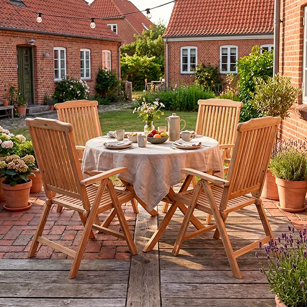 Havemøbelsættet er fremstillet i massivt teaktræ (Grade C), som er kendt for sin styrke og velegnethed til det danske sommervejr. Teak er et levende naturmateriale, som med tiden vil udvikle en smuk grålig patina, hvis det ikke behandles, hvilket giver møblerne et klassisk og naturligt udtryk.