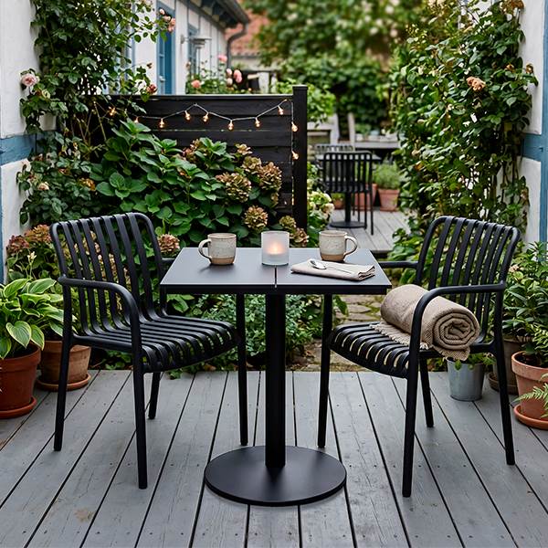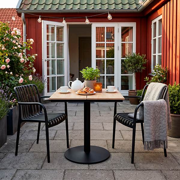 Det enkle formsprog gør Birkholm cafébordet let at kombinere med forskellige typer havestole og øvrige udendørsmøbler. Bordets neutrale design gør det fleksibelt i både moderne og mere klassiske udeområder.