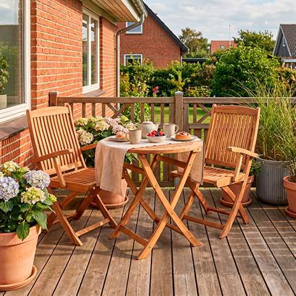 Cafésæt i massiv teak - 2 foldestole med armlæn og Ø70 cm rundt bord