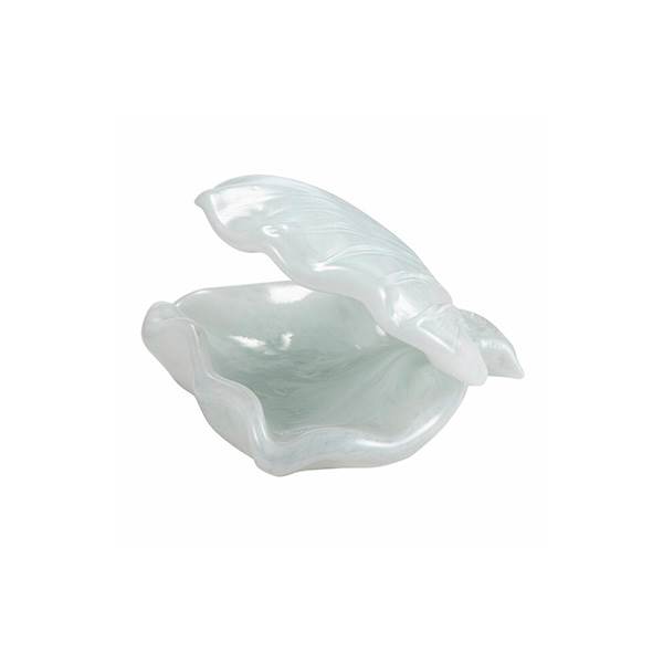 Dekorativ skål udformet som en åben muslingeskal med tilhørende låg. Skålen har en organisk, bølgende form, der efterligner en naturlig skalstruktur, og fremstår i en lys, perlemorsskinnende hvid nuance. Overfladen er glat og let transparent, hvilket giver genstanden et elegant og let udtryk. Låget er formet som den øverste del af skallen og ligger let forskudt, så skålens indre er delvist synligt. Helhedsindtrykket er skulpturelt og raffineret, velegnet som dekorativ genstand eller opbevaringsskål.