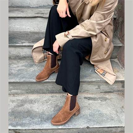 En klassisk Chelsea-støvle udført i blødt ruskind med elastikindsatser i begge sider. Modellen er designet med en behagelig pasform og en let blokhæl, der tilfører et elegant løft samtidig med at sikre god støtte til hverdagsbrug.