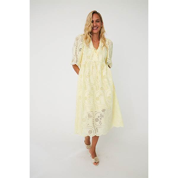 Breeze Dress er en kjole, der forener et ubesværet udtryk med en elegant fremtoning. Det fine broderie anglaise-stof skaber et let og luftigt helhedsindtryk, mens den afslappede pasform, V-udskæringen og bindedetaljen foran bidrager til et feminint og sofistikeret udtryk. De delikate ærmer og midi-længden gør kjolen velegnet til både uformelle sommerdage og mere særlige lejligheder.
