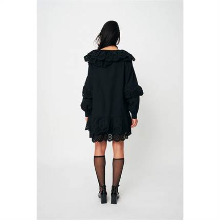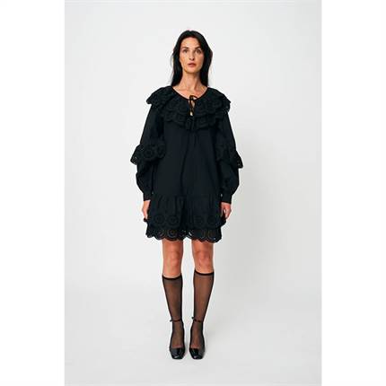 Nellacras Dress repræsenterer ubesværet elegance med et romantisk præg. Den løstsiddende silhuet og korte længde skaber et let og legende udtryk, mens de fine broderie anglaise-detaljer tilfører kjolen både karakter og dybde. Flæser langs krave, ærmer og nederdel fremhæver et blødt og feminint fald, og bindebåndet ved halsudskæringen understreger den afslappede, men nøje gennemtænkte stil. Denne kjole kombinerer æstetisk skønhed med funktionel komfort og er velegnet til både hverdag og mere formelle lejligheder.
