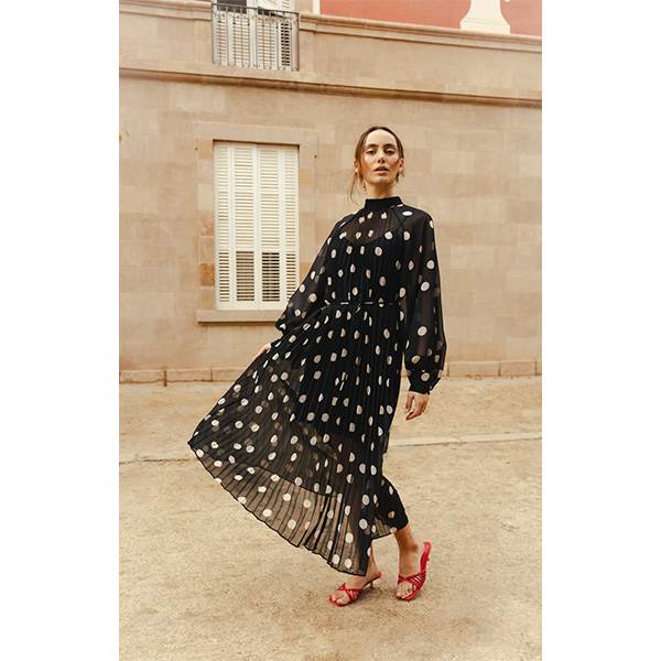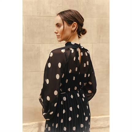 Rachelcras-kjolen forener klassisk femininitet med et nutidigt designudtryk. De bløde plisséer giver kjolen et let og luftigt fald, mens den løse pasform bidrager til et elegant og ubesværet udtryk. Det grafiske prikkemønster tilfører et dekorativt og levende element, som gør modellen velegnet til både hverdagsbrug og festlige anledninger. Det fine bindebånd i taljen muliggør individuel tilpasning af silhuetten efter ønske.