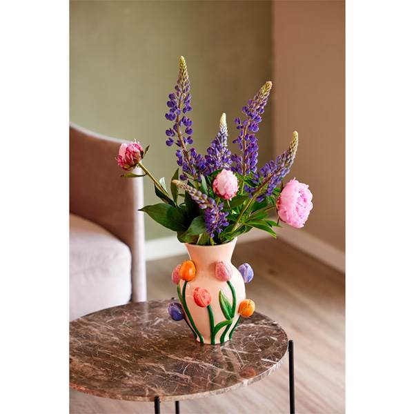 Denne charmerende vase i keramik er et dekorativt statement, der bringer personlighed og farve ind i hjemmet. Vasen har en blød, organisk form og er udsmykket med håndlavede blomsterknopper i harmoniske nuancer af rosa, lilla, orange og blå, som giver et legende og kunstnerisk udtryk. De grønne, stiliserede stilke understreger det botaniske look og skaber en smuk helhed.