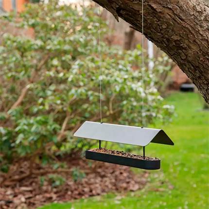 Eva Solo Fuglefoder-bar tilføjer liv og aktivitet til haven og fungerer som et trygt og indbydende opholdssted for småfugle året rundt. Foderhuset hænger fra tynde stålwirer, hvilket gør det nemt at ophænge på en gren, krog eller pergola.
