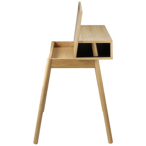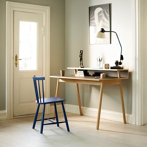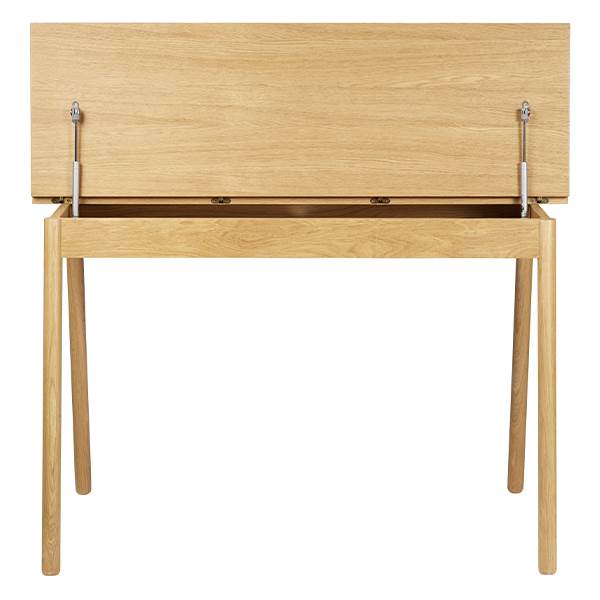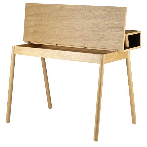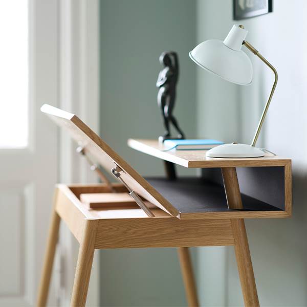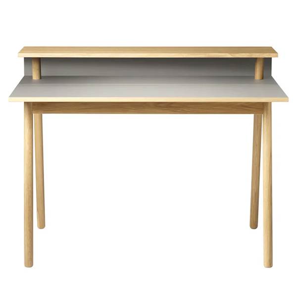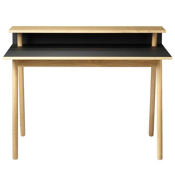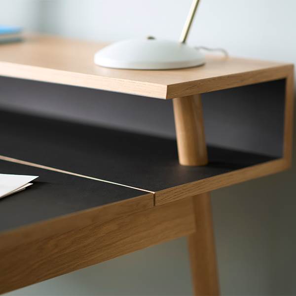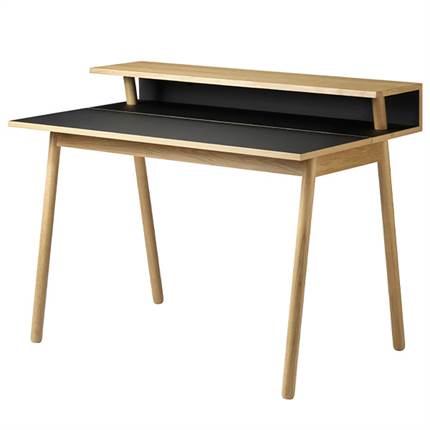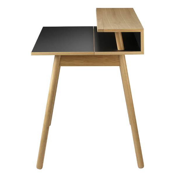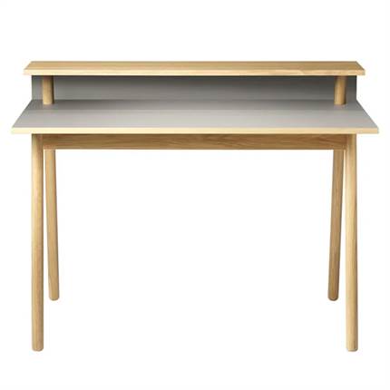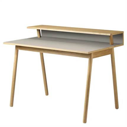 Skrivebordet er fremstillet i massiv eg, hvilket sikrer høj kvalitet og lang holdbarhed. Det naturlige materiale giver et varmt og tidløst udtryk, som understreges af de elegante farvevarianter i sort og light grey.