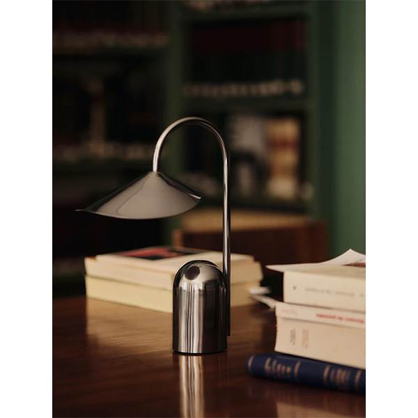 Lampens form svarer til Arum-bordlampens, men denne bærbare version er fremstillet udelukkende af pulverlakeret jern og aluminium, hvilket giver holdbarhed og en elegant finish. Designet bevarer kollektionens karakteristiske elegance og balance med den kronbladsformede skærm, der ser ud til at svæve fra den stilklignende stang. Lampen har en tretrins berøringsdæmper, der giver en justerbar omgivelsesbelysning for at opfylde dine behov for lysstyrke.