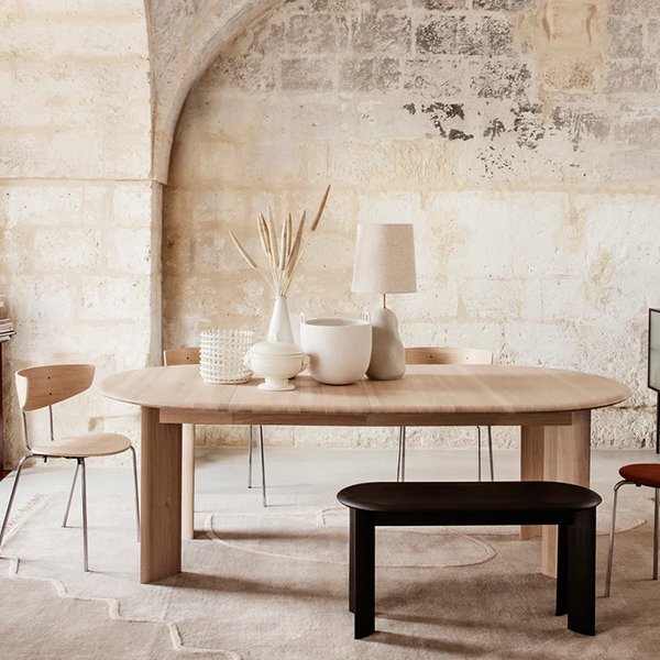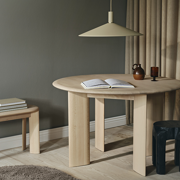 Bevel spisebord fra Ferm Living er udført i massiv hvidolieret eg, FSC®-certificeret, hvilket kombinerer bæredygtighed med holdbarhed og et tidløst skandinavisk udtryk. Bordet måler Ø: 117 cm. To medfølgende tillægsplader gør det nemt at udvide bordpladen og skabe plads til ekstra gæster. Når tillægspladerne er i har bordet målene: B: 217 x H: 73 x D: 117 cm og vejer 76 kg.