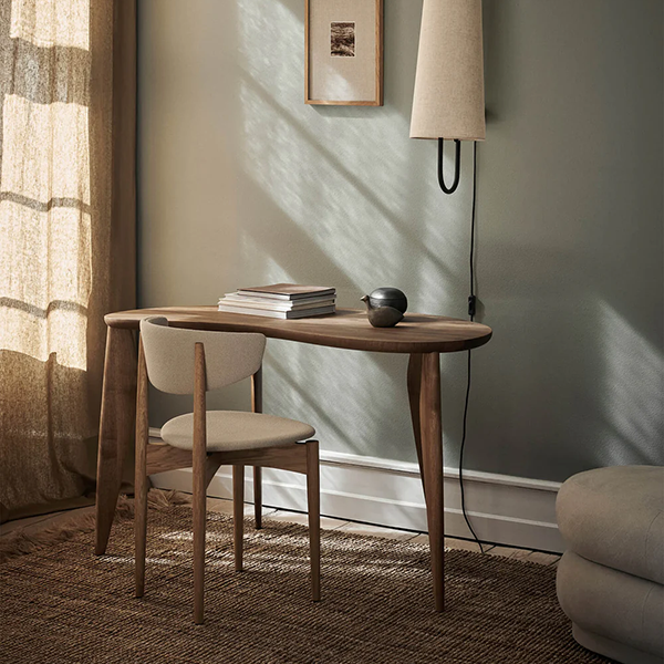 Feve Desk fra Ferm Living er et smukt skrivebord fremstillet i FSC®-certificeret massiv europæisk valnød, der kombinerer holdbarhed med et organisk og delikat udtryk. Med dimensionerne B: 117 x H: 73 x D: 60 cm og en vægt på 25 kg passer det perfekt ind i mindre rum uden at gå på kompromis med stil og funktionalitet.