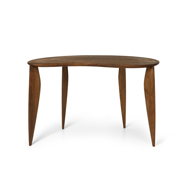 Skrivebordets navn, Feve, stammer fra det franske ord for "bønne" og refererer til den karakteristiske, elegante form. De udskårne ben i udspændte elliptiske former fremhæver skrivebordets feminine silhuet og skaber en harmonisk balance i designet.