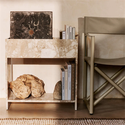 Stone Plant Box with Shelf fra Ferm Living er en elegant og raffineret version af den klassiske plantekasse, fremstillet i førsteklasses fransk cremefarvet marmor med bløde sandfarver. Den måler B: 28 x H: 65,5 x D: 65 cm og vejer 42 kg, hvilket giver den både stabilitet og en solid, eksklusiv fornemmelse. Plantekassens design inkluderer en praktisk hylde og solide fødder, som sikrer stabilitet og samtidig fremhæver det sofistikerede udtryk.