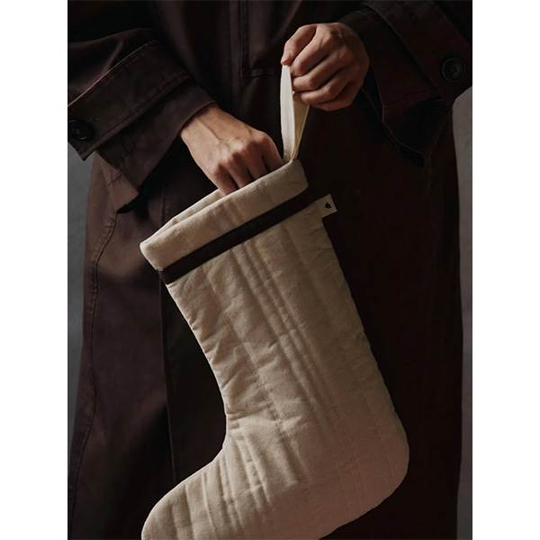 Den quiltede Vari-julesok er fremstillet af genanvendt bomuld med fyld af genanvendt polyester og udgør en stilfuld og kreativ måde at præsentere julegaver på. Sokken har en blød overflade med en let glans, der fremhæver farvens dybde, mens de uregelmæssige quiltede syninger tilfører designet et håndlavet og autentisk præg. Øverst afsluttes den med et bomuldsbånd, hvilket fuldender et udtryk, der forener elegance, klassicisme og moderne æstetik.