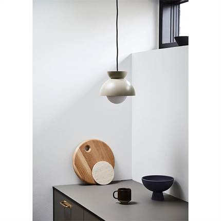 Lyset udsendes behageligt gennem den opaliserede bund, hvilket sikrer en blød og jævn belysning. Hertil bidrager de små, diskrete perforeringer i lampens top med et let, ambient lys, der fremhæver lampens elegante form og skaber en stemningsfuld atmosfære.