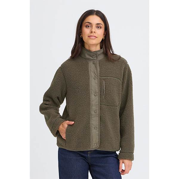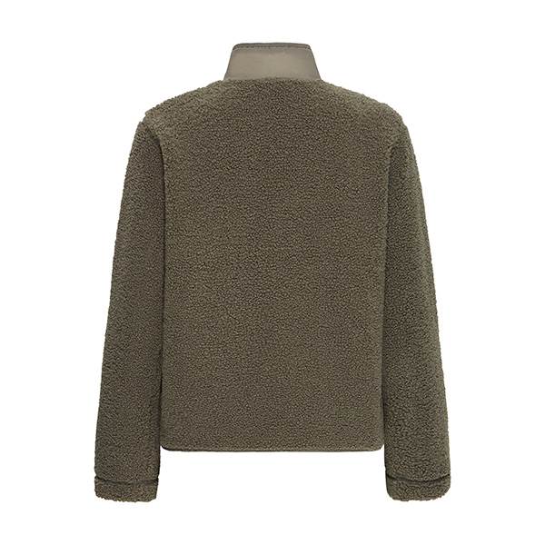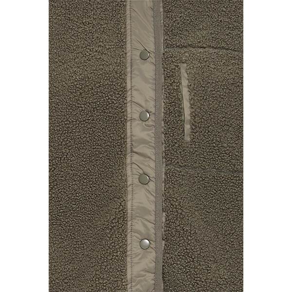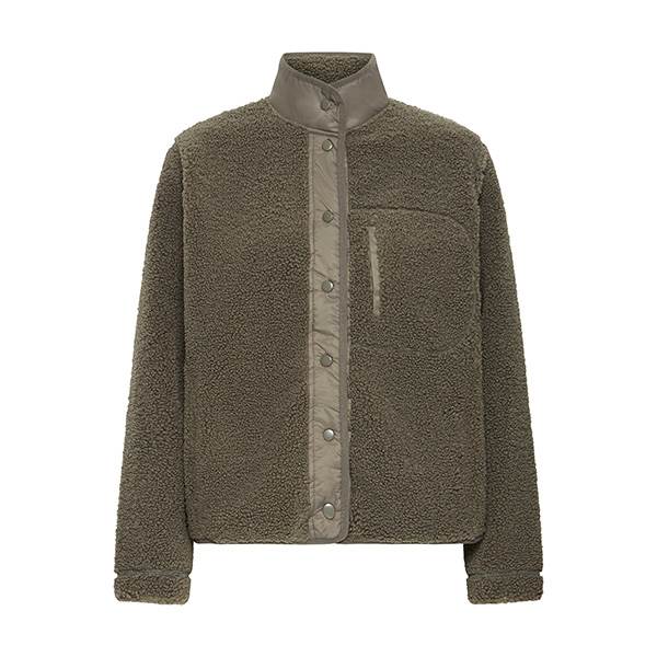 Sherpa-jakke med boxy silhuet, gennemknappet front og høj ståkrave. Jakken har lange ærmer, en brystlomme med lodret lynlåslukning samt en struktureret overflade.