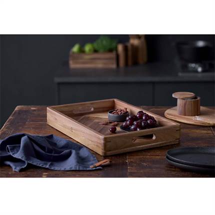 Bakke fremstillet i akacietræ med et elegant sildebensmønster. Den forhøjede kant samt de integrerede bærehåndtag gør bakken særligt velegnet til præsentabel servering af morgenmad, snacks og drikkevarer. Mål: 40 × 30 cm.
