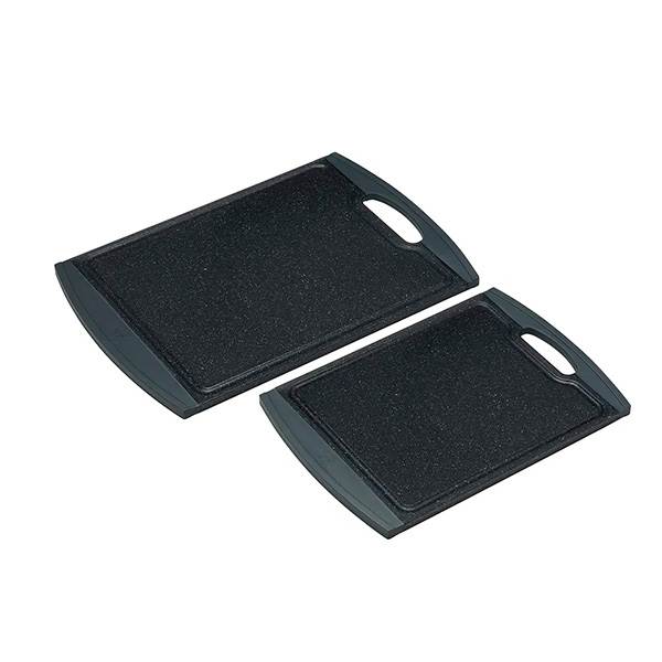 Sæt bestående af 2 skærebrætter med kant i gråt gummi. Mål: 29,2 × 20,3 × 1 cm og 36,8 × 25,4 × 1 cm.