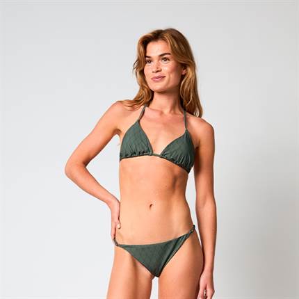 Grøn trekantsbikini fra Hype The Detail med et H printmønster i samme nuance. Bikinitoppen er udstyret med bindebånd i nakken og ved ryggen, hvilket sikrer en justerbar og komfortabel pasform. Materialesammensætning er 83 % polyamid, 17 % elastan.