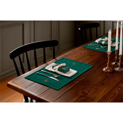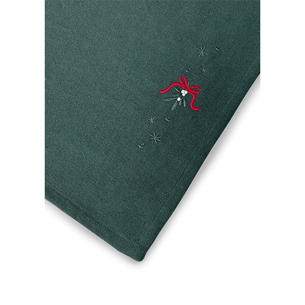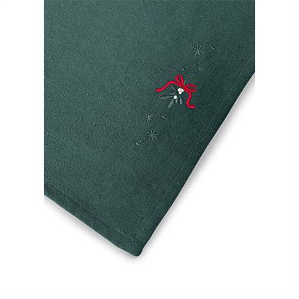 Denne elegante JUNA Christmas Fable-dækkeserviet i dyb julegrøn er udsmykket med to broderede motiver af seriens karakteristiske mistelten, omgivet af fine små julestjerner, der fremhæves langs dækkeserviettens kanter. Dekorationerne forbliver synlige, selv når dækkeservietten anvendes med tallerkener og bestik.