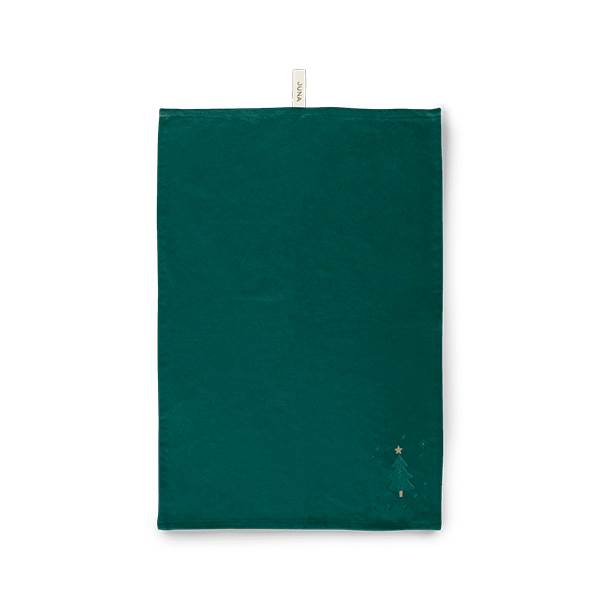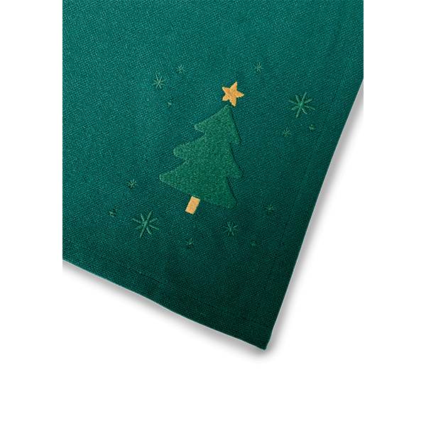 Dette elegante JUNA Christmas Fable-viskestykke i dyb julegrøn er udsmykket med et broderet motiv af seriens karakteristiske juletræ, omgivet af fine små julestjerner, placeret stilfuldt i viskestykkets nederste højre hjørne.