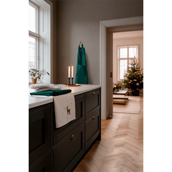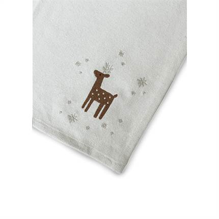 Dette elegante JUNA Christmas Fable-viskestykke i en klassisk råhvid er udsmykket med et broderet motiv af seriens karakteristiske rensdyr, omgivet af fine små julestjerner, placeret stilfuldt i viskestykkets nederste højre hjørne.
