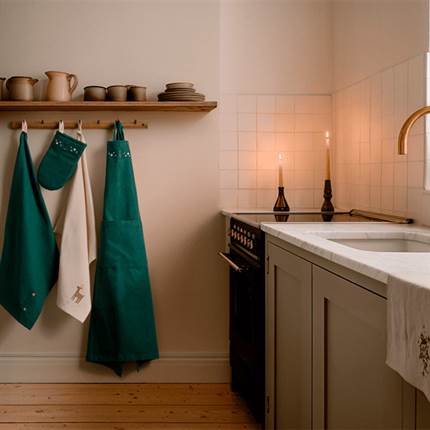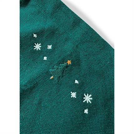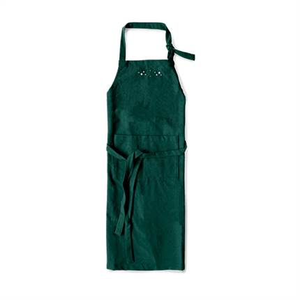 Dette elegante JUNA Christmas Fable-forklæde i dyb julegrøn er udsmykket med et broderet motiv af seriens karakteristiske juletræ, omgivet af fine små hvide julestjerner, som smukt og stilfuldt pryder forklædets øverste del.