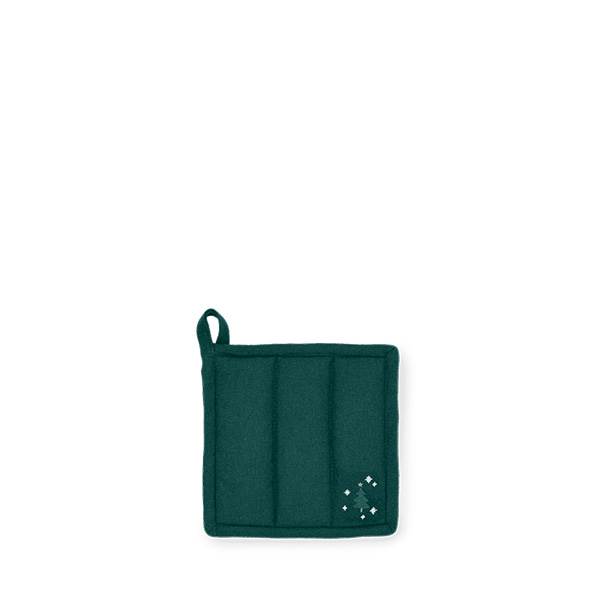 Denne elegante JUNA Christmas Fable-grydelap i dyb julegrøn er udsmykket med et broderet motiv af seriens karakteristiske juletræ, omgivet af fine hvide julestjerner, som smukt pryder grydelappens nederste højre hjørne.