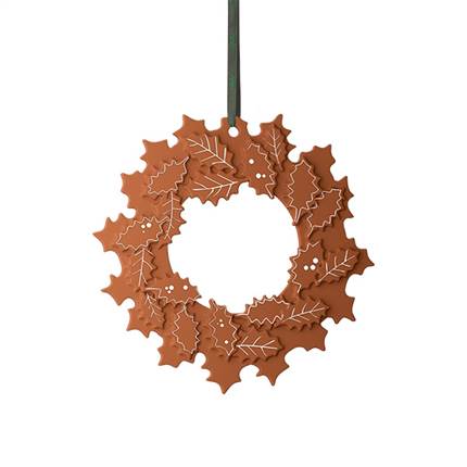 Kähler Gingerbread Julekransen, med en diameter på 18,5 cm, er ideel som dekoration på væggen, i vinduet eller på døren gennem hele december. Traditionen med at bruge kranse som julepynt har en lang historie, og især kristtjørn har været et klassisk materiale til at skabe en smuk og stemningsfuld krans. Denne tradition er her genskabt i stentøj, hvor de elegante blade giver kransen en taktil og levende fremtoning. Kransen er dekoreret med en hvid glasur, der skaber en smuk kontrast til stentøjets varme brune tone. Gingerbread Julekransen kan bruges år efter år uden at drysse og udgør en smuk og stemningsfuld tilføjelse til julepynten.