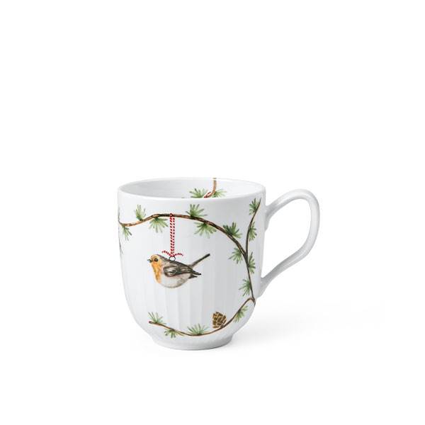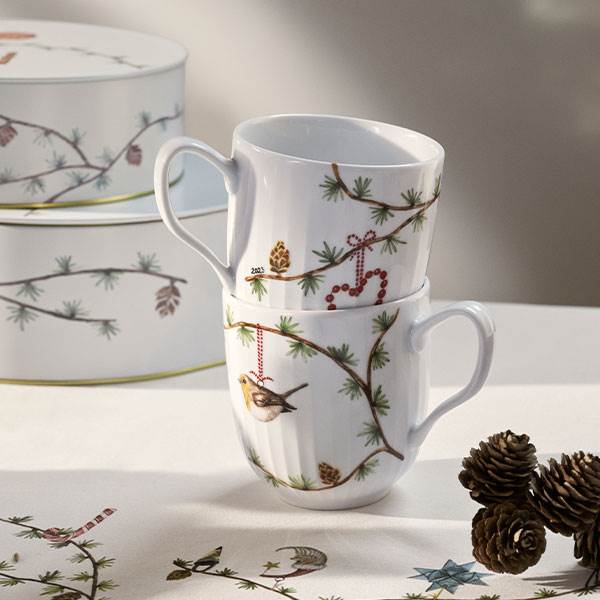 Julekruset 2023 fra Hammershøi Christmas er med sine 33 cl perfekt til julens varme drikke, lige fra den traditionsbundne gløgg i løbet af december til aftenkaffen, når roen sænker sig efter julemiddagen. Det er lavet i porcelæn og er dekoreret med en gennemgående cedergren, der i 2023-udgaven er pyntet med et rødt hjerte med røde julebær, et blåt juletræsophæng i guldsnor og en lille fugl, der har fundet vej hen over kanten af kruset.