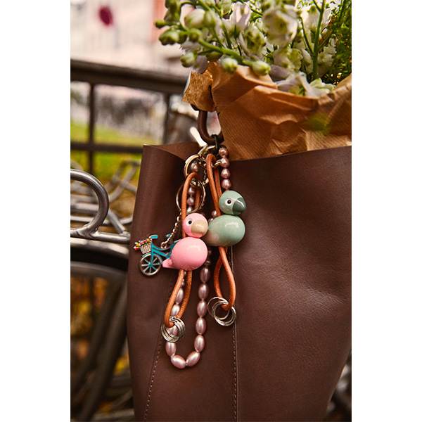 Kay Bojesen Fugl sølvtonet metal nøglering med naturlæder rosa