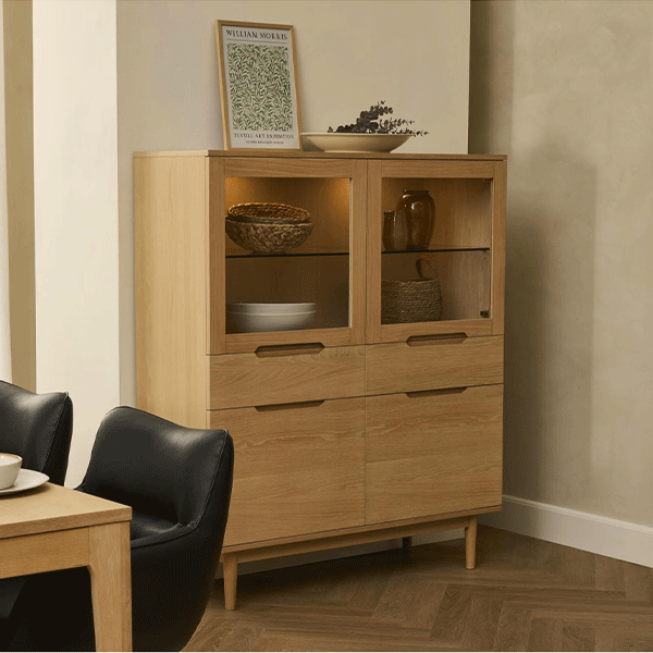Highboardet er udstyret med fire låger, to skuffer og fire justerbare hylder – både glas (8 mm) og træ (18 mm) – som giver fleksibel opbevaring til dekorationer, bøger og hverdagsting. Den integrerede LED-belysning fremhæver indholdet, mens soft-close-systemet sikrer blød og lydløs lukning af både låger og skuffer.