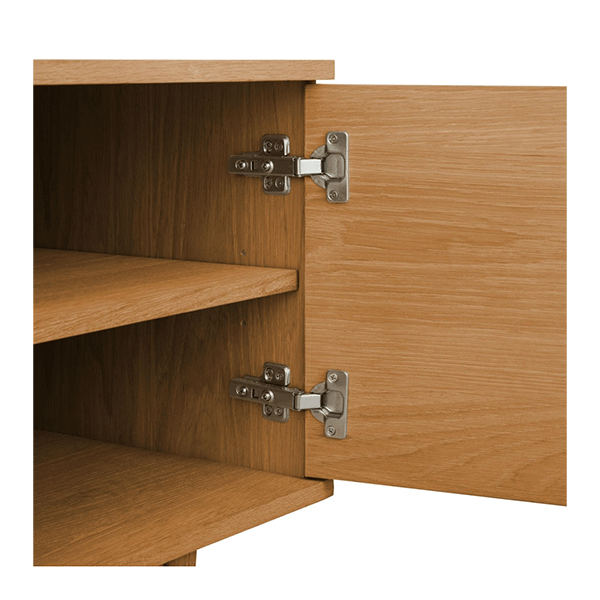 TV-bordet har to låger og tre justerbare hylder (18 mm), der giver fleksibel opbevaringsplads til tv-udstyr, konsoller, bøger og dekorationer. De fræsede håndtag understreger det stilrene design, mens soft-close-systemet sikrer blød og lydløs lukning.