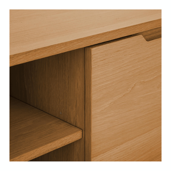 Kerteminde TV-bord er fremstillet i massivt træ, egetræsfiner og MDF med en smuk naturlig oliefinish, der fremhæver træets struktur og giver bordet et varmt og elegant udtryk. Bordet kombinerer funktionalitet med tidløst design, som passer ind i både moderne og klassiske hjem.