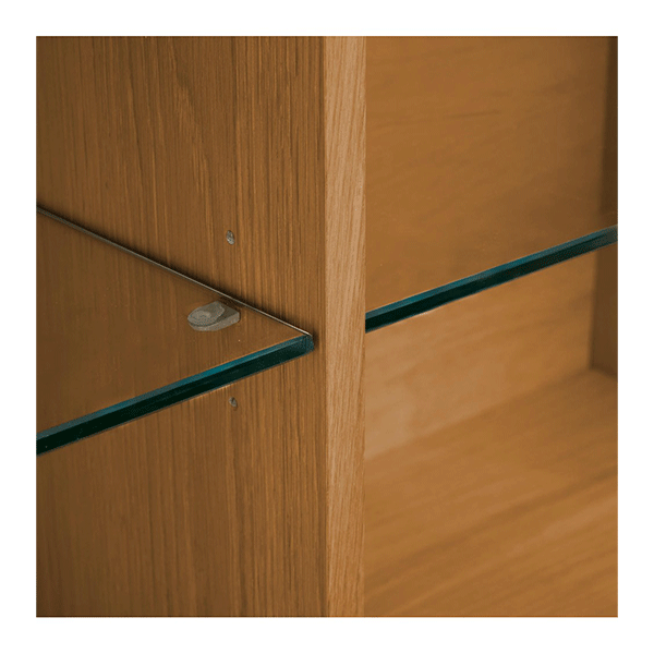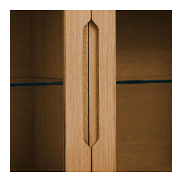 Skabet er udstyret med tre døre og tre justerbare hylder i 8 mm hærdet glas, som giver fleksibel opbevaring og et let visuelt udtryk. De justerbare hylder gør det nemt at tilpasse pladsen efter dine behov – uanset om du ønsker at fremvise dekorationer eller opbevare hverdagsting.