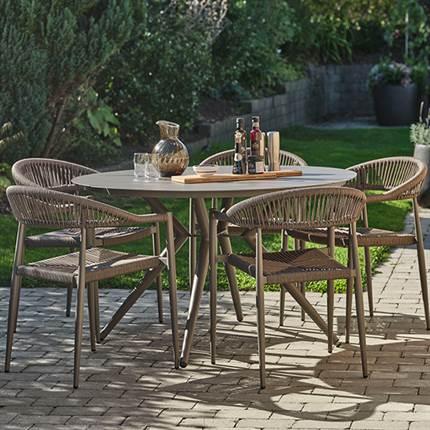 Corfu bordet er fremstillet i aluminium, som er et let og holdbart materiale, der ikke ruster og kræver minimal vedligeholdelse. Det gør bordet særdeles velegnet til udendørs brug i det nordiske klima.