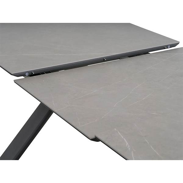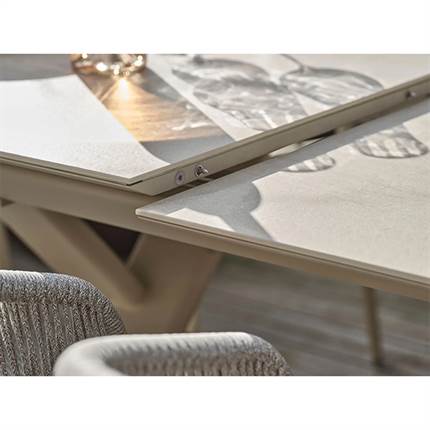 Bordpladen er fremstillet i keramik, som er et slidstærkt og modstandsdygtigt materiale, der tåler både varme, sol og skiftende vejrforhold. Stellet er lavet i aluminium, hvilket gør bordet stabilt, let og velegnet til udendørs brug.