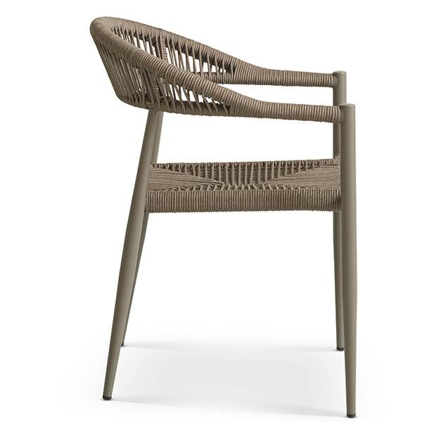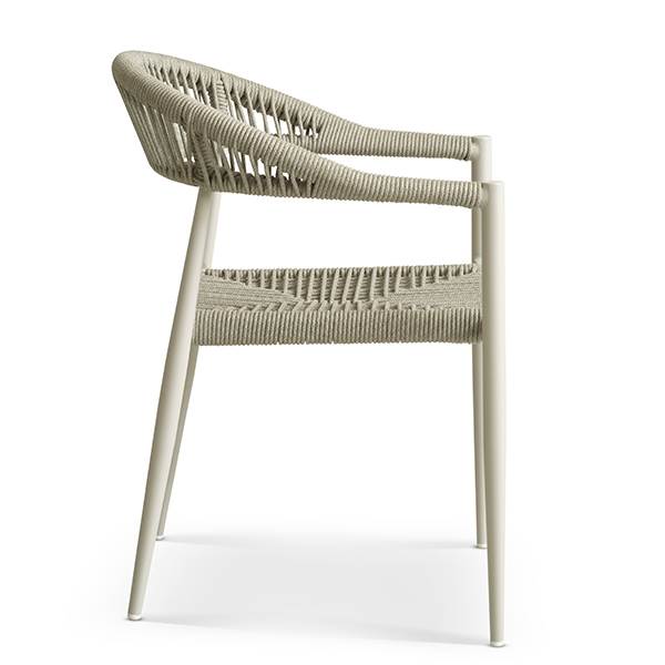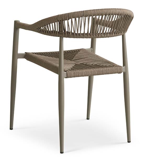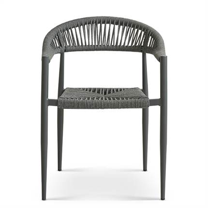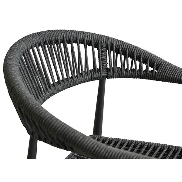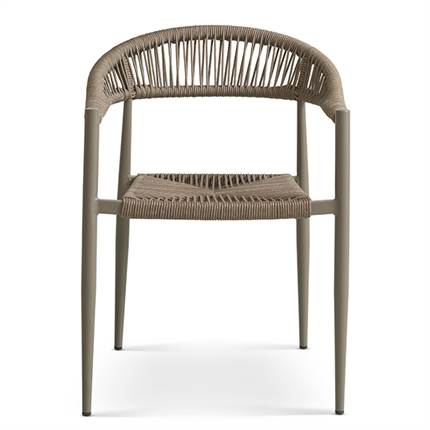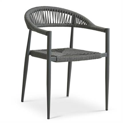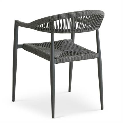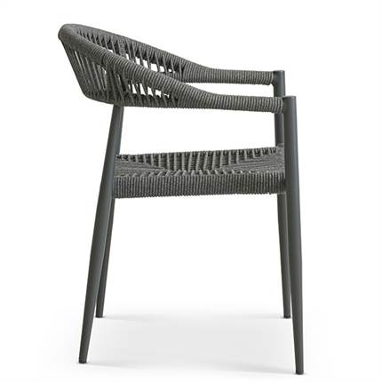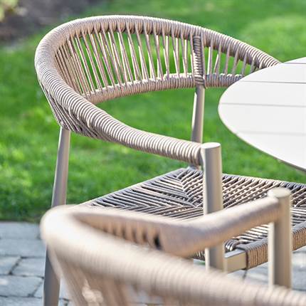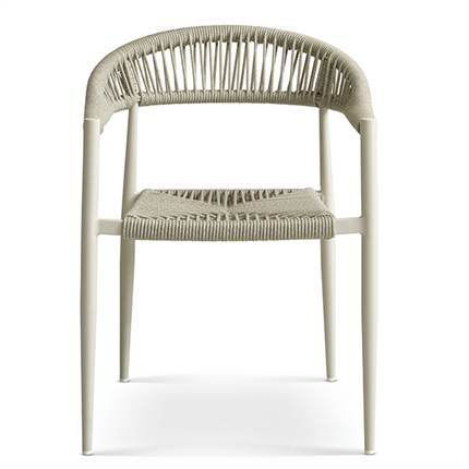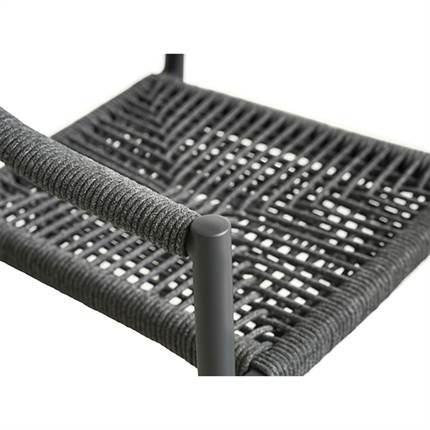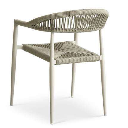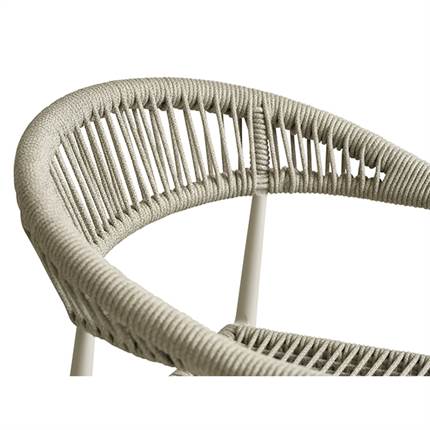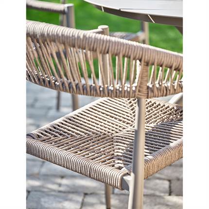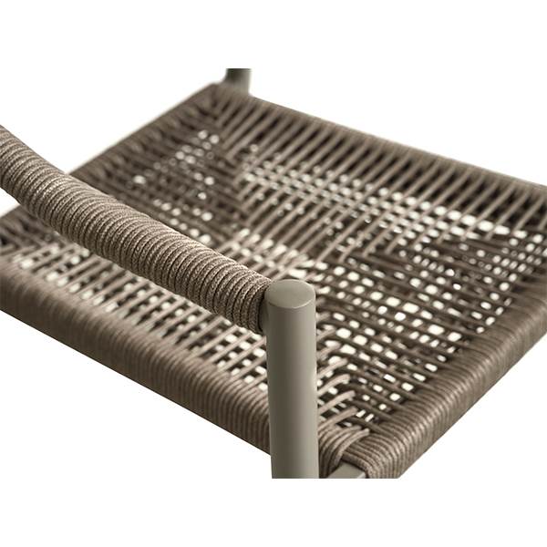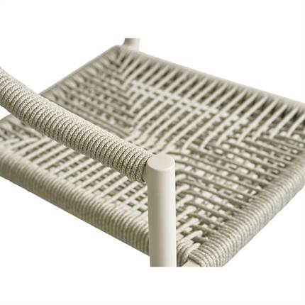 Stolen er fremstillet i aluminium kombineret med flettet reb, hvilket giver et let og elegant udtryk samt en solid konstruktion, der egner sig til udendørs brug. Materialerne er slidstærke og kræver minimal vedligeholdelse, så du kan nyde stolen sæson efter sæson.