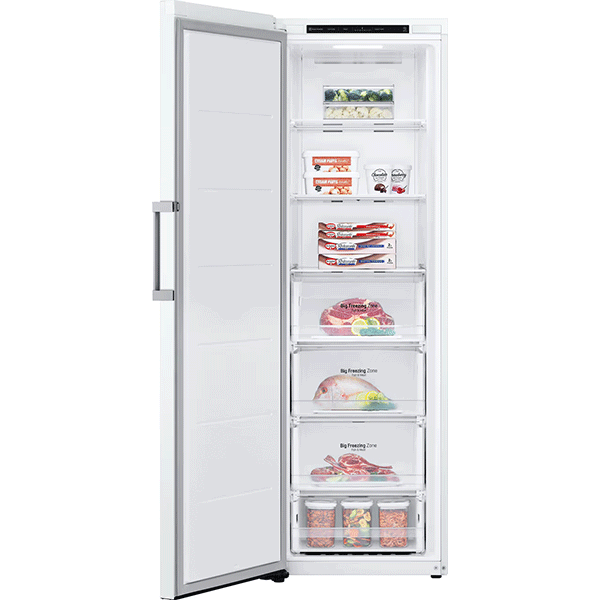 Fryseskabet er udstyret med LG Total No Frost-teknologi, som forhindrer isdannelse og eliminerer behovet for manuel afrimning. Det sikrer en jævn temperatur og bedre opbevaringsforhold for dine madvarer – samtidig med at du sparer tid og energi.