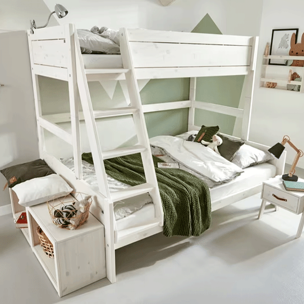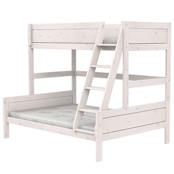 Sengen er robust bygget og leveres med en sikker stige, der gør det nemt for børnene at komme op og ned. Den kombinerede løsning med én enkeltseng (90 × 200 cm) og én lidt større seng (120 × 200 cm) giver fleksibilitet i hverdagen og gør det muligt at tilpasse sovepladserne efter barnets alder eller behov.