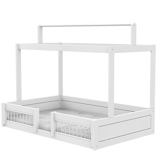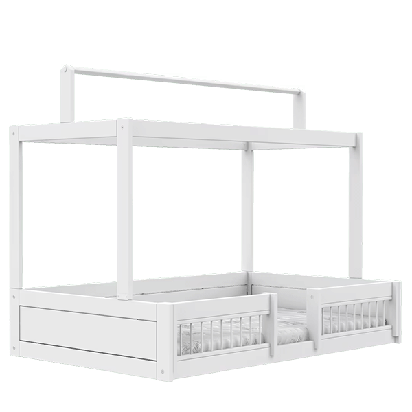 Den lave gulvkonstruktion gør det nemt for barnet selv at kravle ind og ud af sengen, og efter at være vokset ud af babysengen kan barnet allerede fra ca. 2-årsalderen begynde at sove i denne seng. De integrerede sengeheste giver ekstra tryghed, mens topkonstruktionen skaber en hyggelig og beskyttende ramme, der inviterer til både ro, læsning og fantasifuld leg.