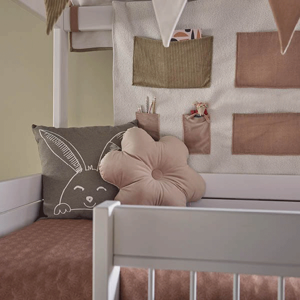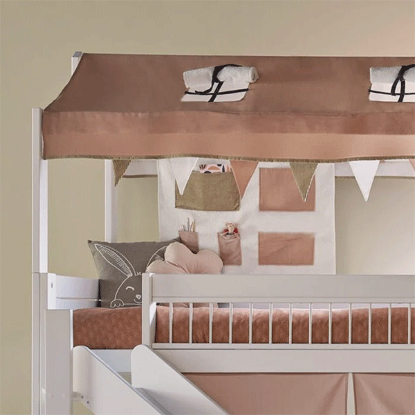 Sengelommen kan nemt fastgøres til tagkonstruktionen eller under den halvhøje seng, så bøger, bamser eller legetøj altid er inden for rækkevidde. Det gør den ideel til både leg, læsning og sengetid.