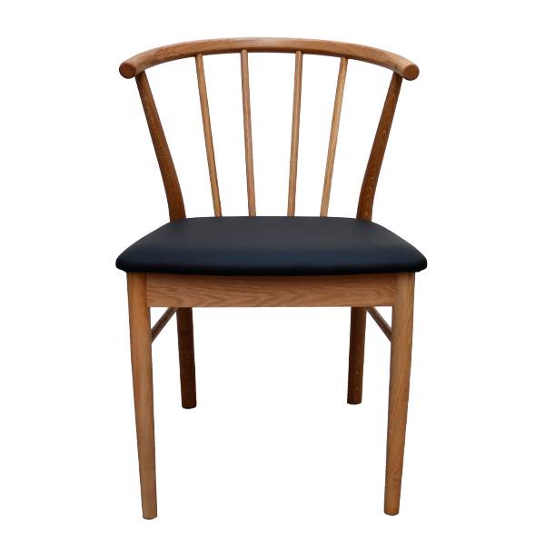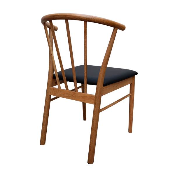Stolen er fremstillet i lakeret eg og har et sort lædersæde, som giver en flot kontrast mellem det naturlige træ og det bløde, eksklusive læder.