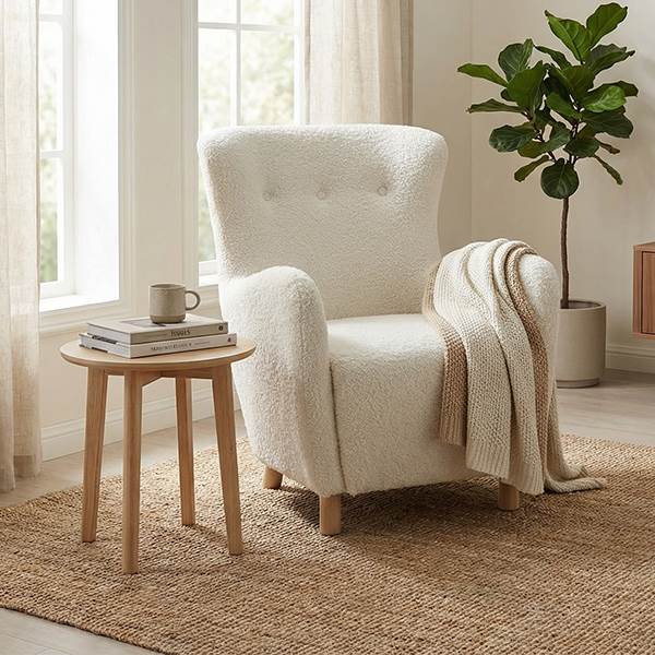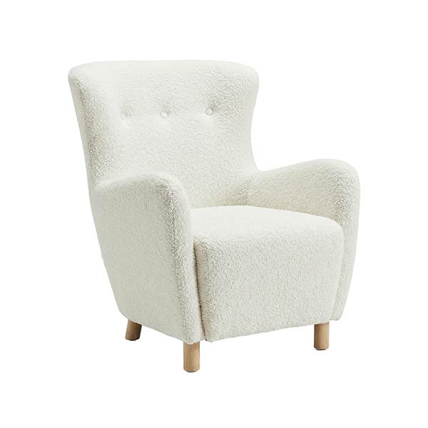 Med sin kombination af blødt teddy‑stof, solide træben og moderne linjer er Milas lænestolen et elegant møbel, der passer ind i mange typer indretning. Den tilbyder en perfekt balance mellem stil og komfort og fungerer både som enkeltstående stol og som del af en større indretning.