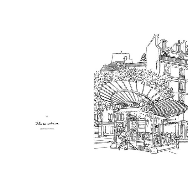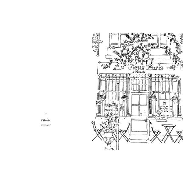 Farvelægningsbogen rummer detaljerede tegninger af klassiske parisiske scener – fra udsigter over byens tage og hyggelige caféhjørner til bohemelejligheder og elegante butiksvinduer. Motiverne er inspireret af kreative mennesker og kunstnere, der oplever byen gennem deres egne unikke perspektiver.