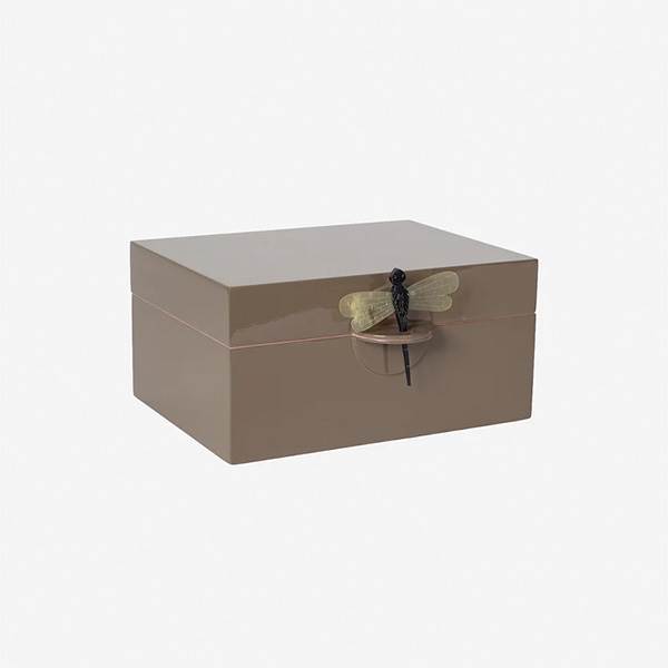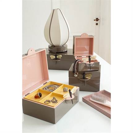 Denne smukke lakæske i størrelse XL måler 24 cm i længden, 18 cm i bredden og 12 cm i højden. Den har en udvendig farve i Eath, som harmonerer flot med den indvendige farvekombination af Powder og Sun.
