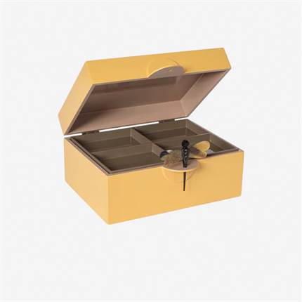 Denne smukke lakæske i størrelse XL måler 24 cm i længden, 18 cm i bredden og 12 cm i højden. Den har en udvendig farve i Sun, som harmonerer flot med den indvendige farvekombination af Powder og Eath.