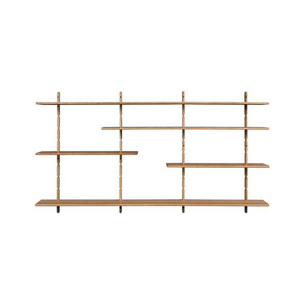 Denne faste opstilling består af fire vanger og fem svævende hylder, som fremhæver systemets minimalistiske lethed og giver en smuk balance mellem struktur og åbenhed. Moore er udført i en kombination af valnød og eg og tilbydes i flere lakerede træsorter, herunder lys eg, natur eg, mørk eg, røget eg og sortlakeret eg, så du nemt kan tilpasse udtrykket til din indretning. På billedet ses reolen i lakeret natur eg.