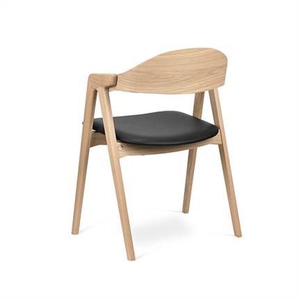 Stolen er fremstillet i finér og fås i to overfladebehandlinger: Light oak lacq. og Natural oak lacq., som begge giver et smukt og naturligt træudtryk. Kombinationen af finér og lakeret finish sikrer en slidstærk og letplejet overflade, der holder sig flot gennem mange års brug.